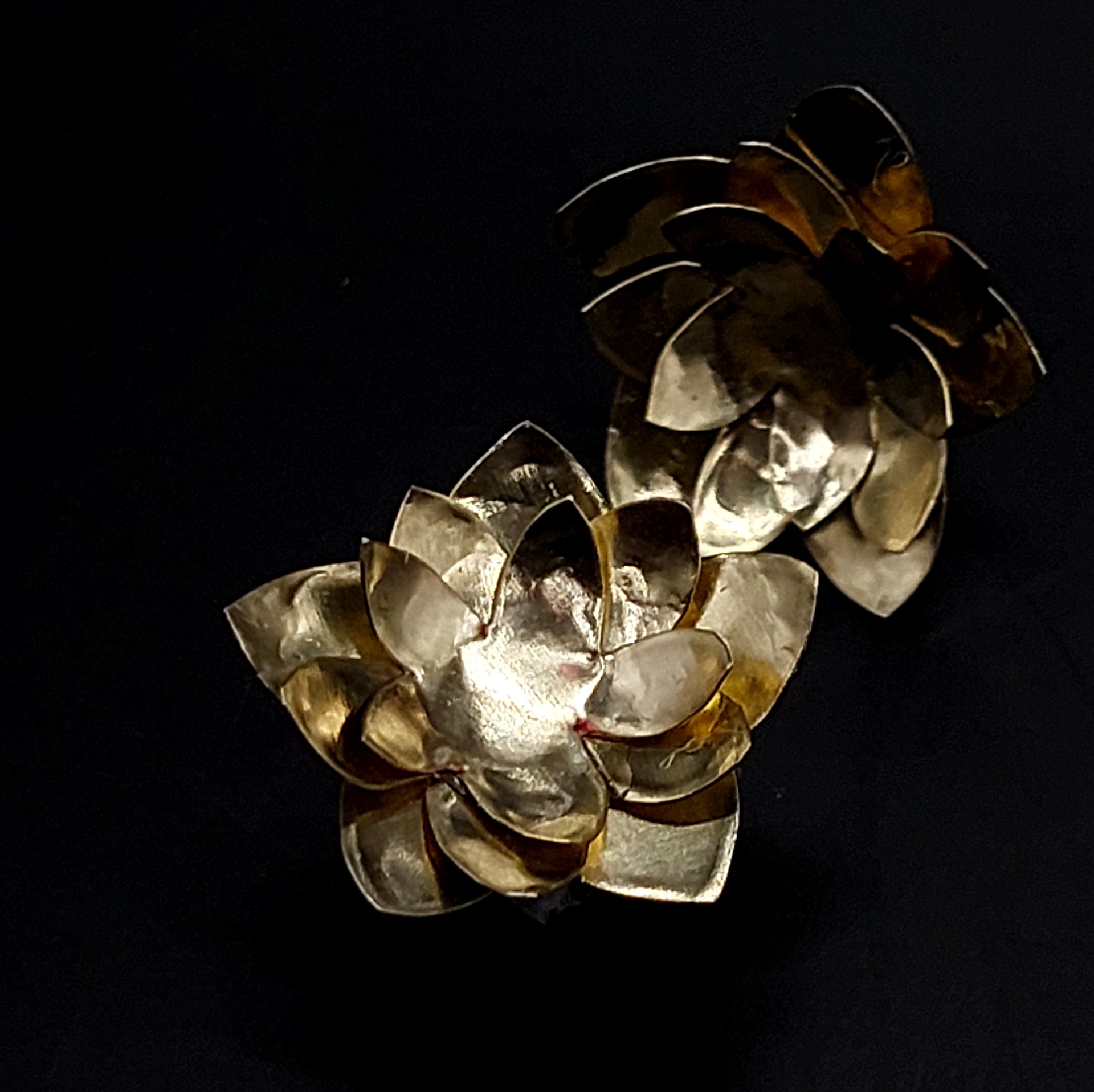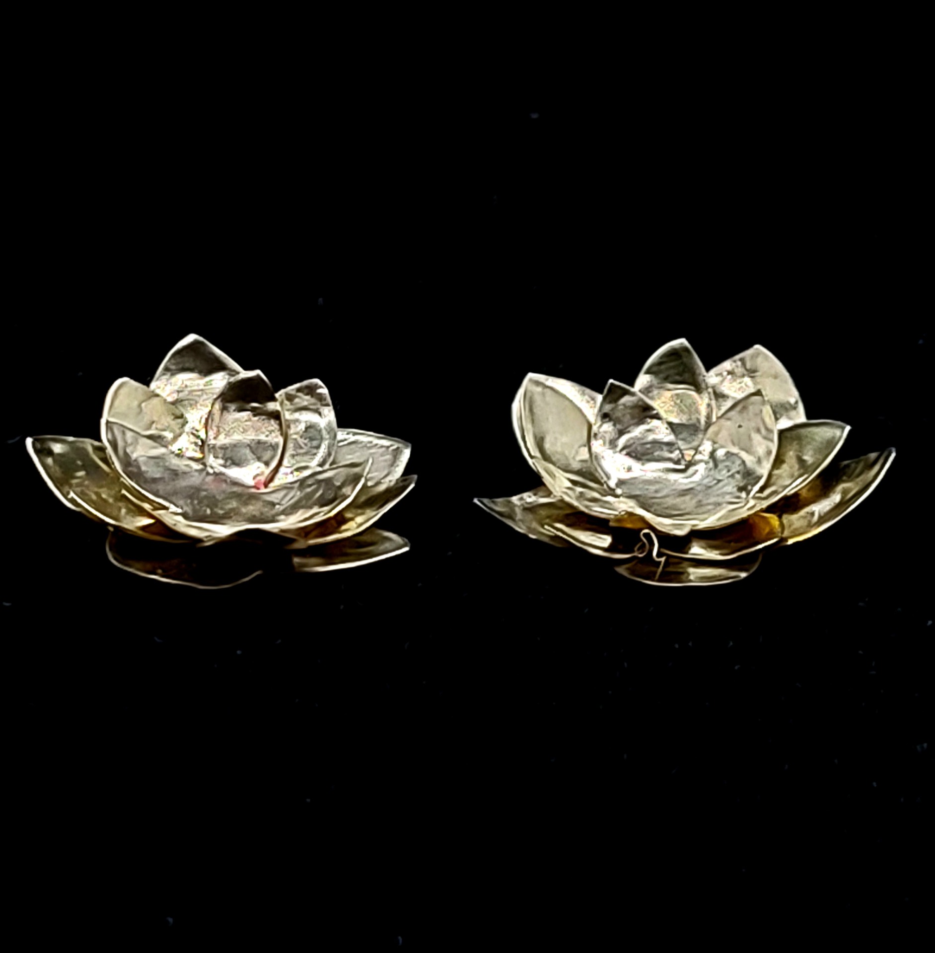 Lótuszvirág formájú, kézzel csiszolt és mintázott hajlított fülbevaló sárgarézből.